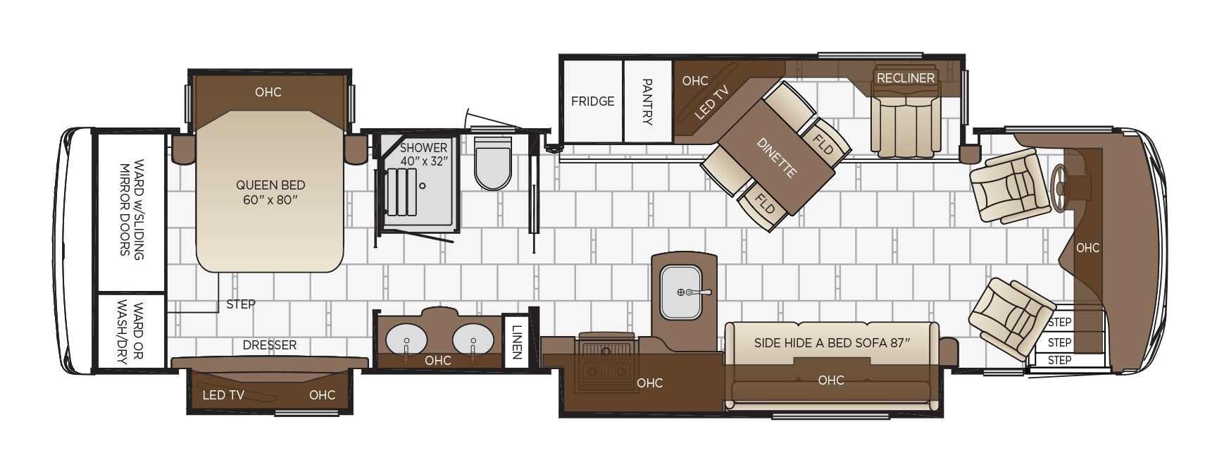 Make a statement on the road with our exclusive full-paint Masterpiece Finish™ in stunning new exterior graphics packages. Inside, discover fresh design elements including new Chestnut wood cabinetry, also available as a two-tone Chestnut and Summit combination.